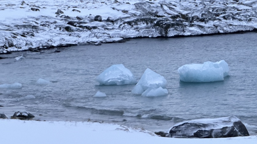 Not the dramatic, movie-poster ones you think of when someone says “iceberg,” but these smaller pieces that look like they broke off something much bigger and drifted in close, like the Arctic casually scattering fragments of itself along the shore for you to study up close; some of them were the size of a truck, which still qualifies as “tiny” here, and some were smaller still, but the color is what keeps pulling your eyes back—this improbable, almost luminous blue that looks like it belongs in a gemstone, not in a chunk of frozen seawater sitting on a beach.